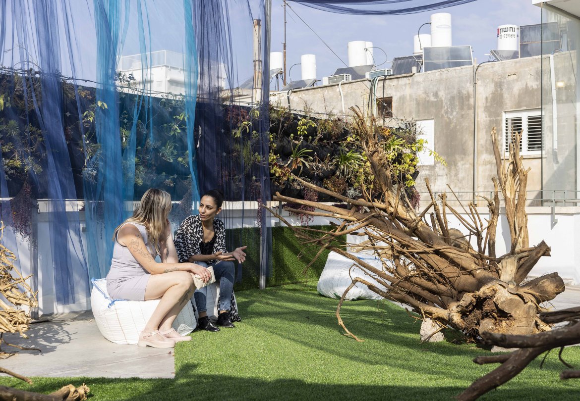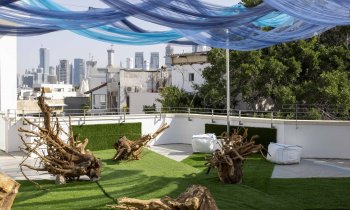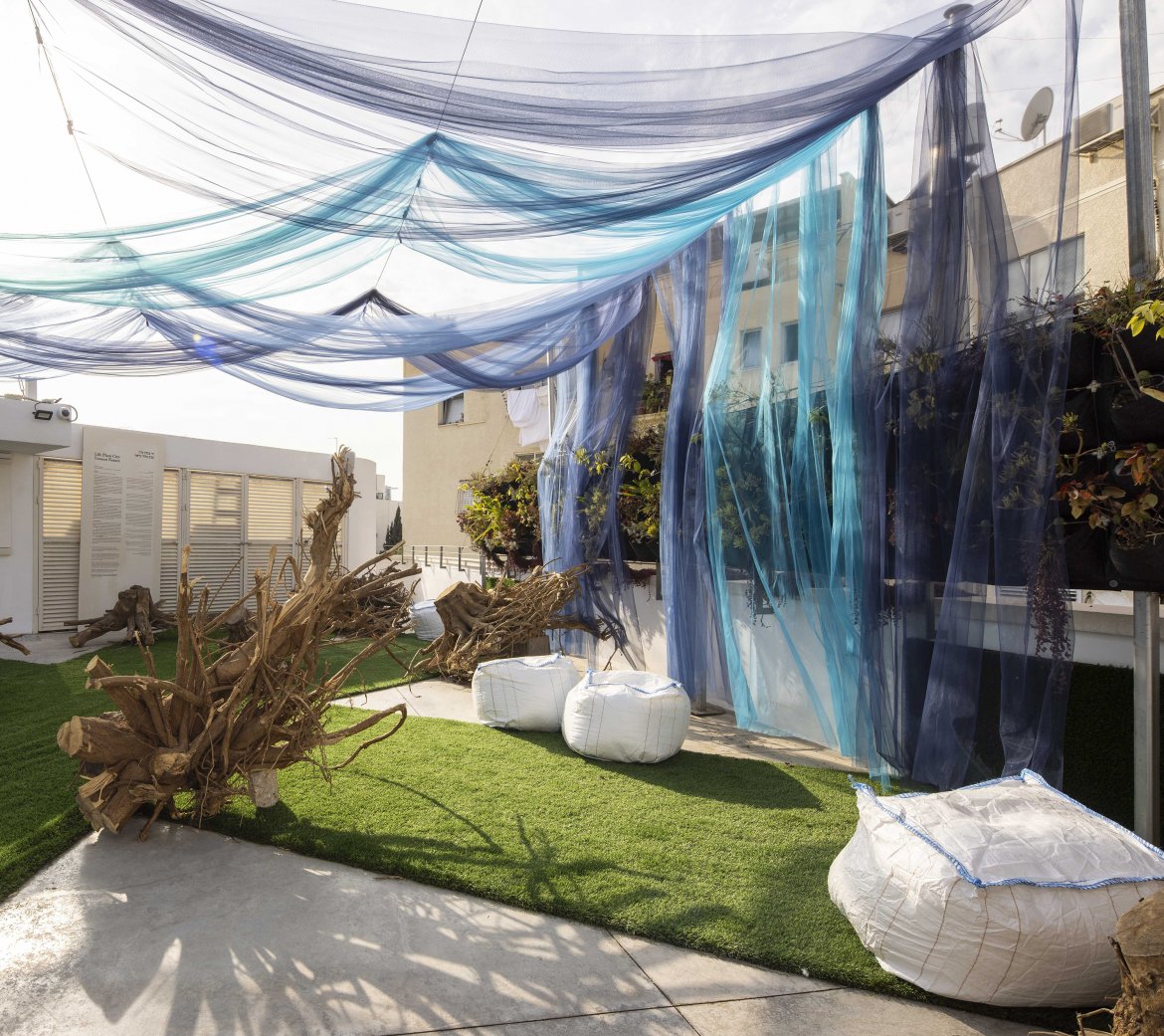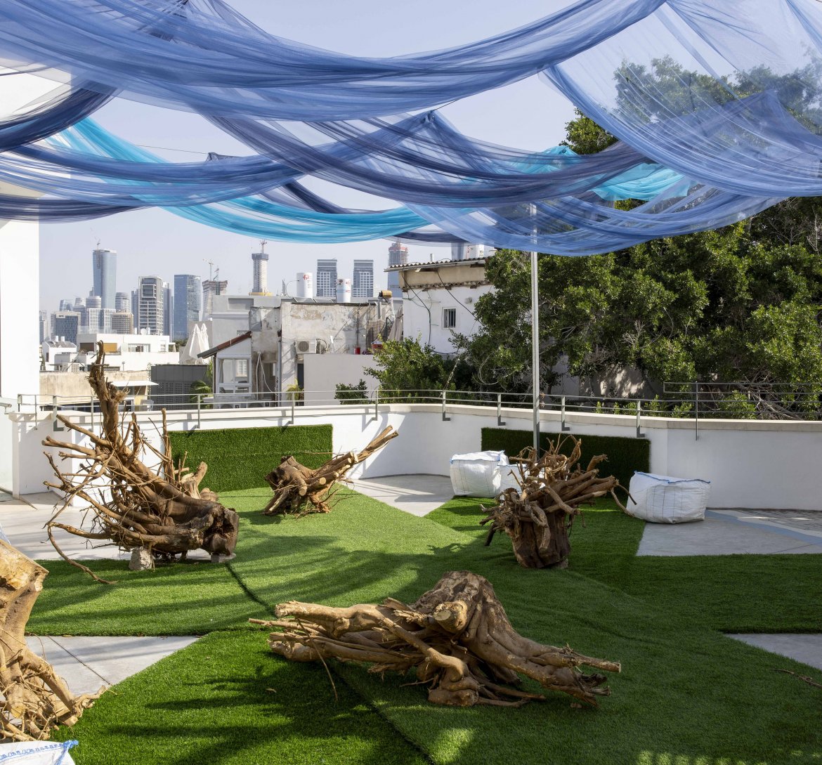 מיצב אומנותי-ביקורתי על הגג של בית ליבלינג, במסגרת התערוכה: "חי, צומח, עיר -100 שנים לתכנית גדס לעיר הגנים של תל אביב".